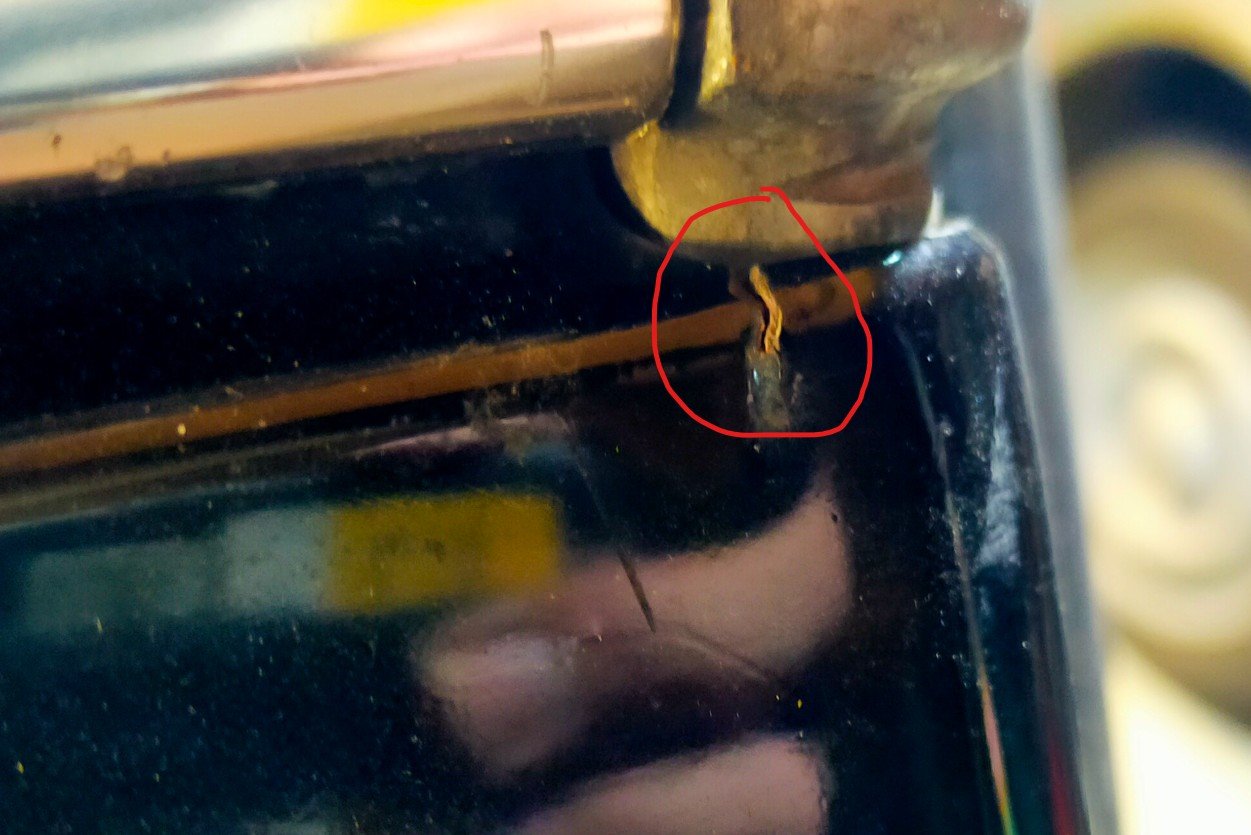 En regardant de près, j'ai constaté que la porte commençait à se fissurer de chaque coté de la charnière.