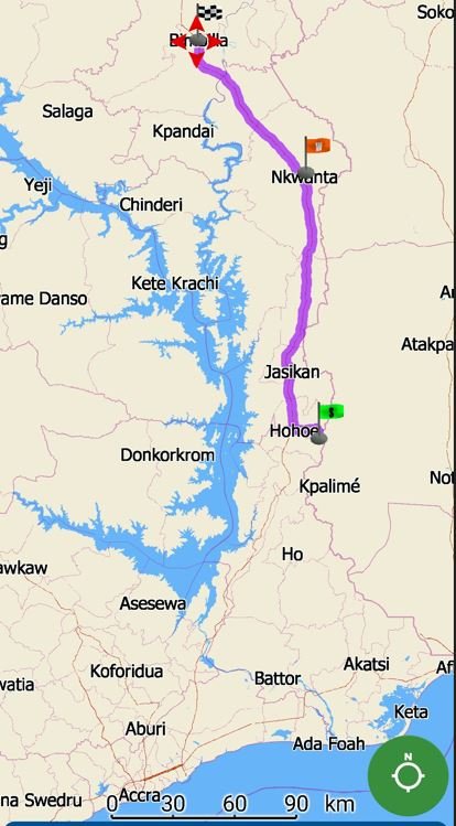 Aujourd'hui, on a roulé jusqu'à la Navrango, la dernière ville avant la frontière avec le Burkina: 328 km avec un départ vers 6h pour profité de la fraicheur du matin. Toute la première parti en direction du nord était très facile avec un goudron sans nid de poules. la partie en direction de l'ouest était une piste parfois assez difficile. Puis une fois arrivé sur l'axe Tamale, Frontière, un goudron truffé de nids de poules, d'énormes dos d'ânes, de contrôles de police et de lourds camion.