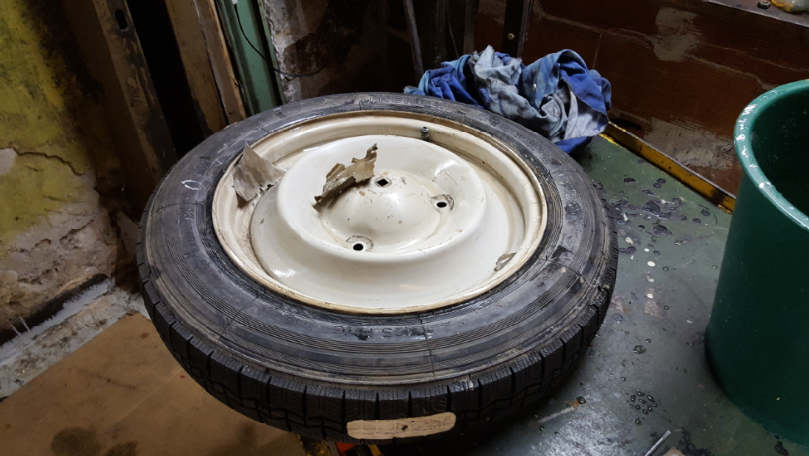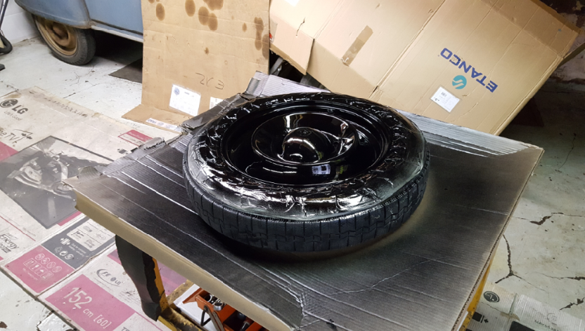 Après avoir choisie les jantes avec le voile le plus faible, j'ai monté des pneus en bon état, poncé, et peint en noir.