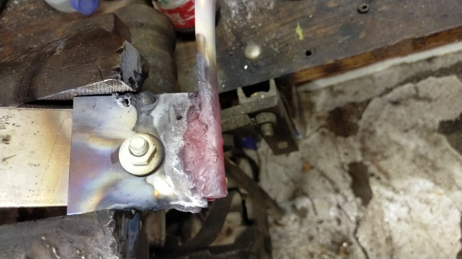 Des petits points de soudure pour éviter toute rotation, sans avoir besoin de serrer trop fort.<br />(sur le bras arrière gauche, j'avais eu une rotation, et j'avais serré très fort pour éviter que ça se reproduise, et finalement le collier à cassé)