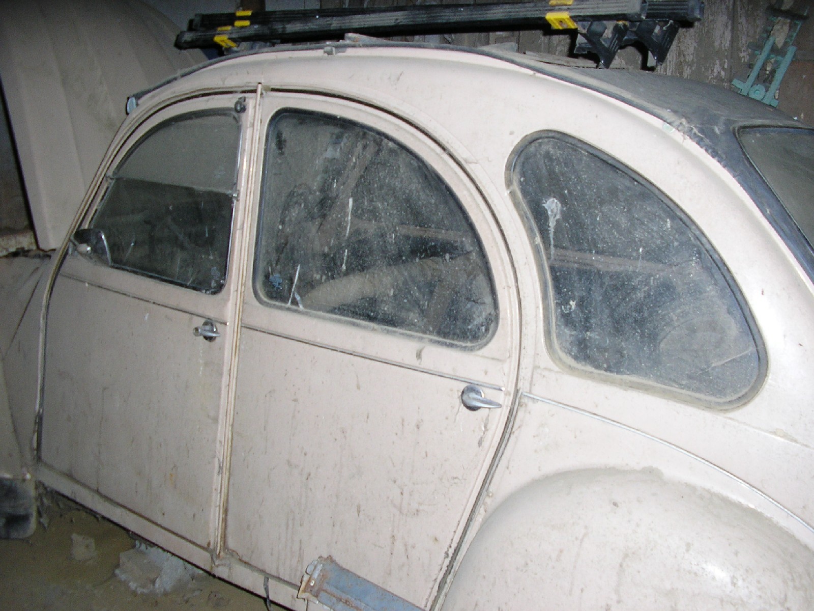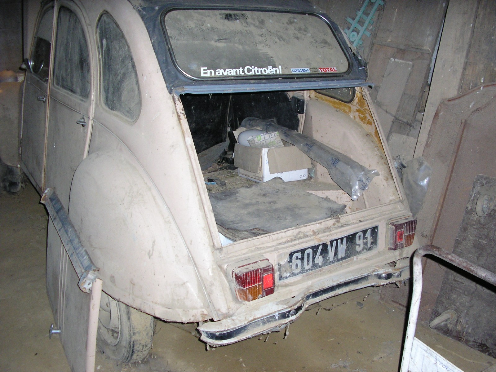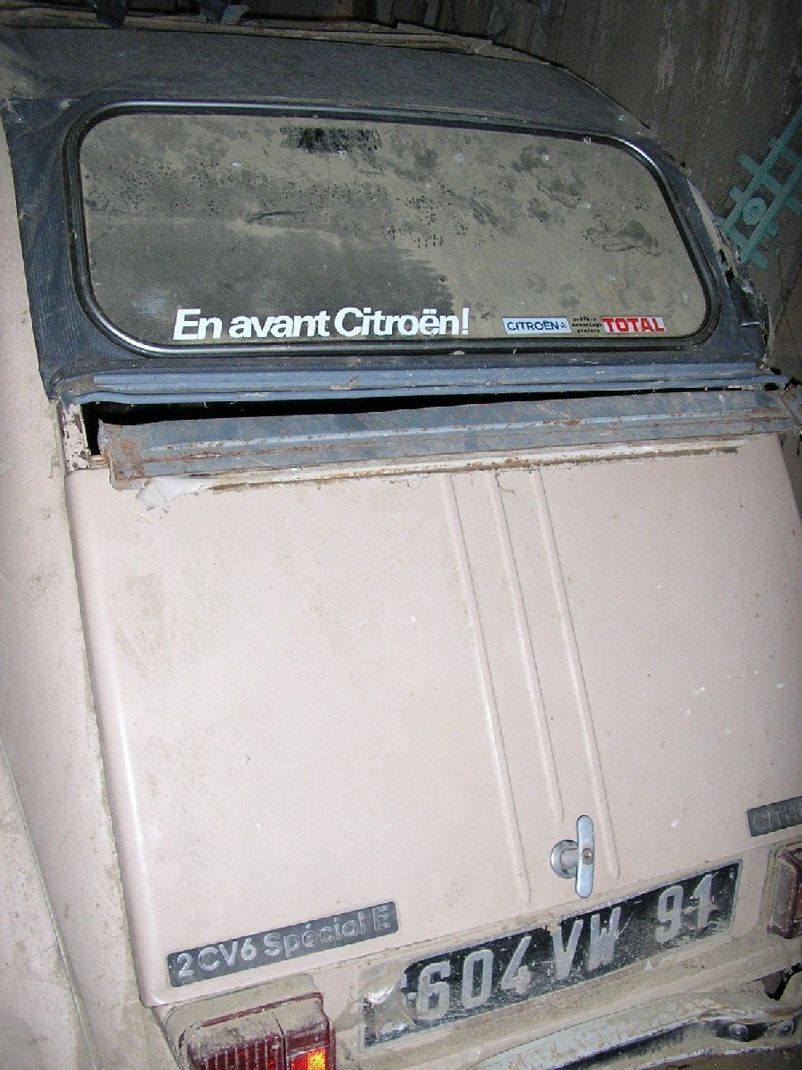Apparemment, y'a du boulot, mais qui dit poussière dit pas trop d'humidité et c'est aussi bien pour une Deuche ! Bon courage et pense à préserver la pub sur la lunette arrière hein !