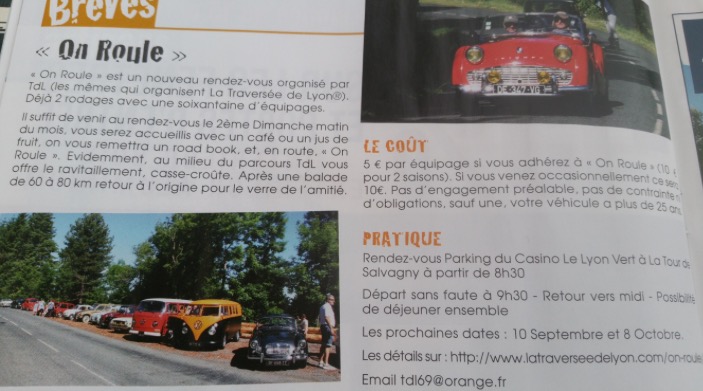 Histoire de rafraichir les mémoires, la 4ème de « On Roule » c’est le 8 Octobre. Ce sera aussi la dernière de l’année. Ce sera la plus longue randonnée, 94 Km au total, en 2 étapes. La première nous emmènera à la cave de Létra en passant par St Loup et la Croix de Thel. Après le traditionnel ravitaillement, une « grimpette » vers le col du Joncin et forcément une descente vers Jarnioux puis Belmont d’Azergues pour rallier le Casino. Pour clore la saison, encore que nous nous reverrons à Epoq’Auto, nos amis et partenaire « Champagne Dallancourt » vous accueilleront avec des bulles dans des flutes. Vous avez compris, à « On Roule » on essaye de bien recevoir nos amis (toute modestie mise à part).