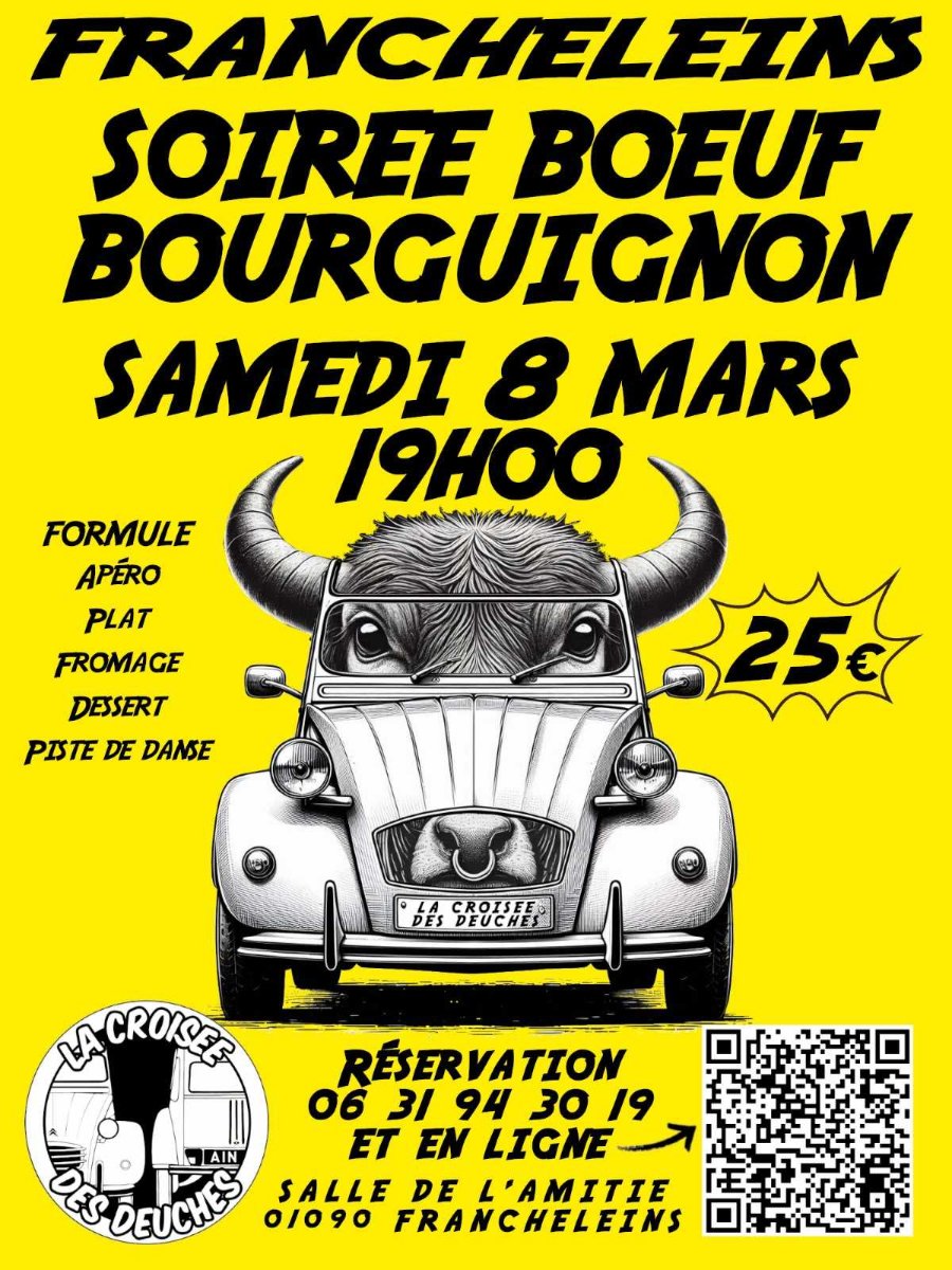 Comme annoncé en réunion, nos amis de la croisée des deuches organisent une soirée bourguignon le mars prochain.